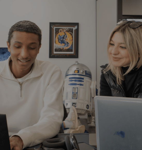 En tant que geeks, nous aimons aussi travailler de chez nous. Nos cours sont hybrides : 50% en physique, 50% en ligne !